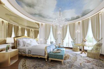 White and gold — a color combination many European societies associate with purity and goodness — permeate the 153-room property. Stark white walls are accentuated with gilded picture frames; smooth, shiny chairs; and even gold cutlery.