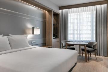 The AC Hotel Cuzco by Marriott is located in the prestigious Paseo de la Castellana in Madrid just 5 minutes away from the Santiago Bernabeu Real Madrid´s stadium. It features a gym and has free Wifi throughout the hotel . The AC Cuzco 318 guest rooms are spacious and modern equipped with a 49” plasma TV with satellite and international channels. Each room has a minibar and a private bathroom. They also have independent air conditioning and heating. The hotel serves a high quality breakfast buffet and a offers a large variety of international dishes prepared with fresh and seasonal products for lunch and dinner. The AC Lounge serves a variety of cocktails and snacks. Room service is also available 24 hours. AC Hotel Cuzco by Marriott is located next to Cuzco's Metro Station, while the Chamartin train station is just 2 km away.